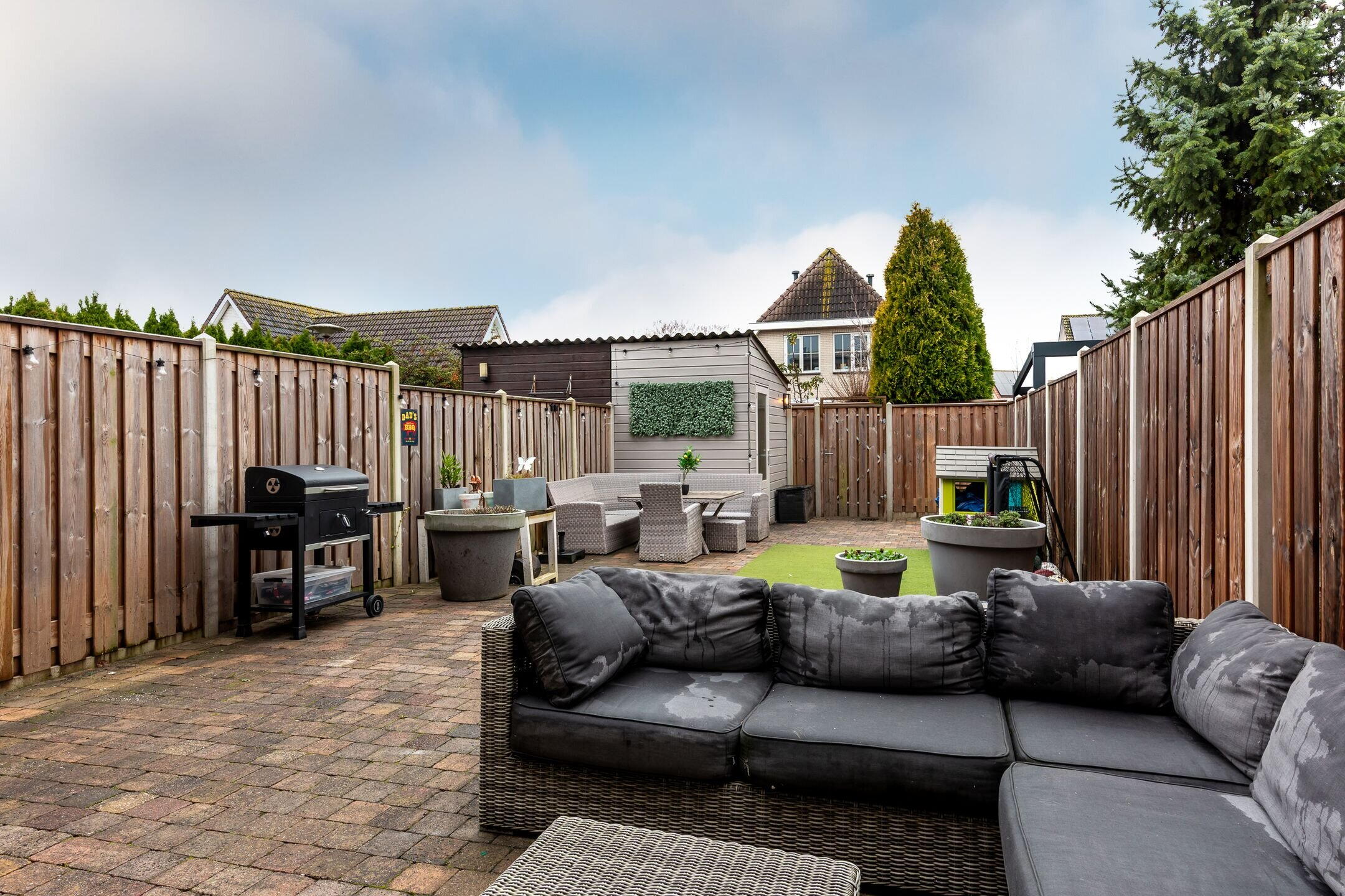 Tuin: De op het oosten georiënteerde voortuin (circa 5 x 5,7 meter) biedt u een vrij gevoel. De zonnige, niet minder dan 15 meter diepe, op het westen gesitueerde achtertuin beschikt over een vrijwel volledige bestrating, hout/betonpalen erfafscheiding, een vrijstaande houten berging alsmede een achterom.